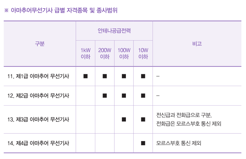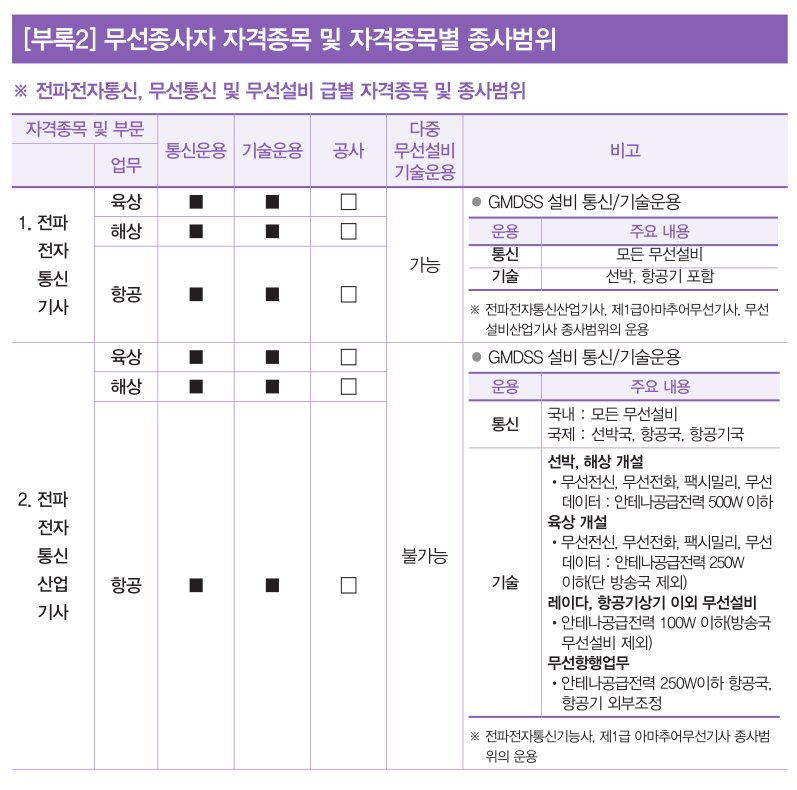 전파전자통신, 무선통신 및 무선설비 급별 자격종목과 종사범위는 다양하다.